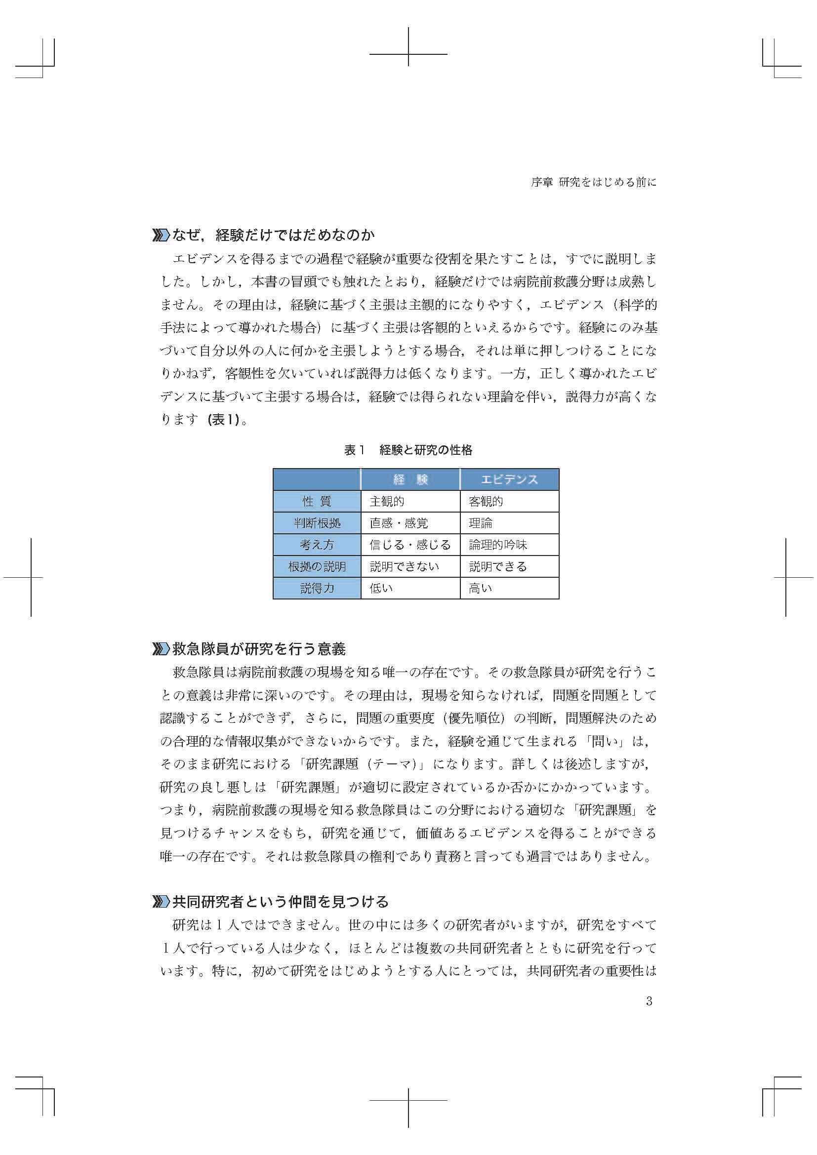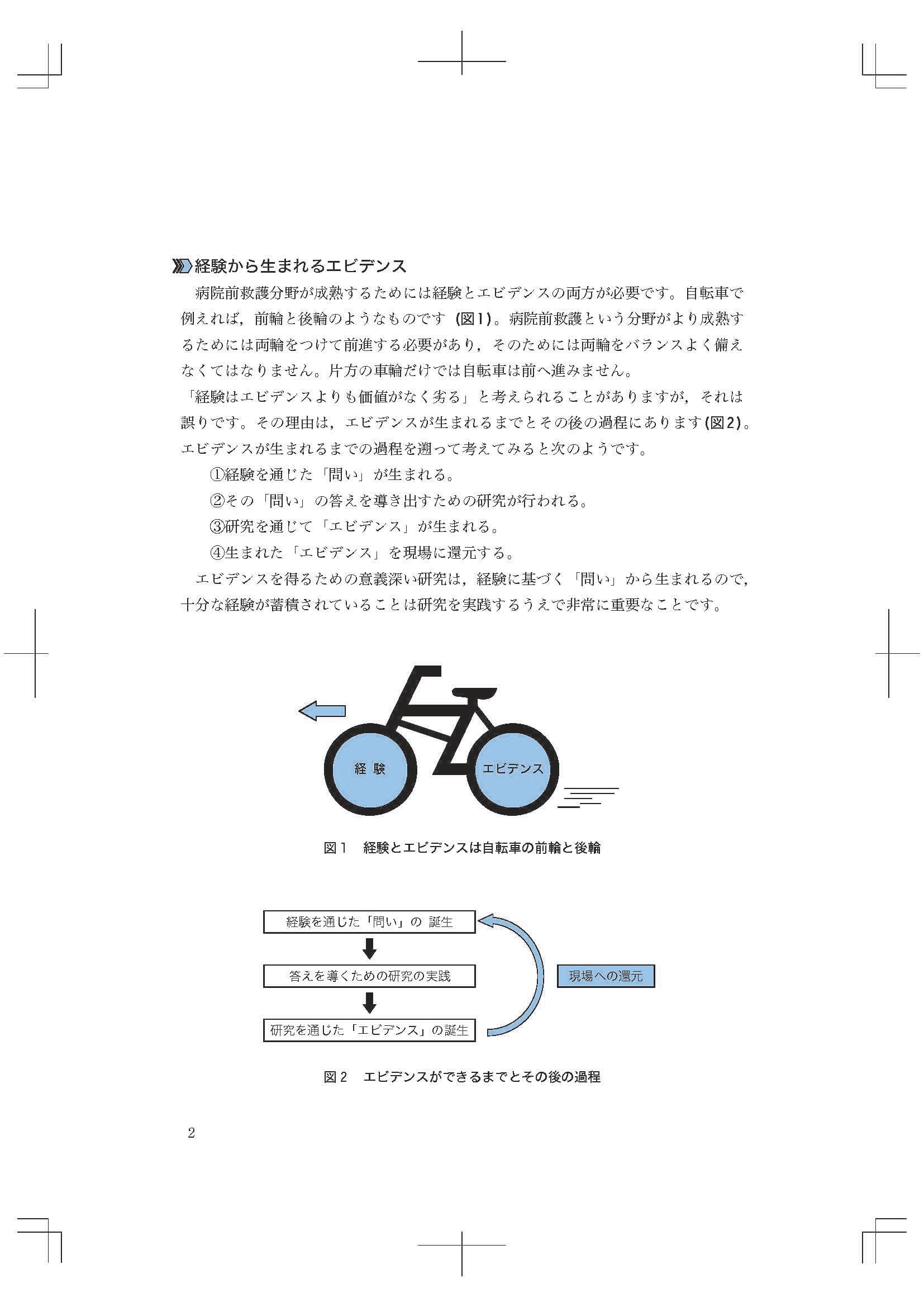 しかし,今日まで病院前救護に関わる 「エビデンス」 はほとんど蓄積されてこなかった。救急隊員は,研究の手法について学ぶ機会に恵まれず,研究という術を身につけてこなかったためである。皮肉なことに,救急隊員は現場にある 「問い」 の本質を唯一知る存在でありながら,病院前救護に関わる研究の実践は外部に依存するしかなかったのである。